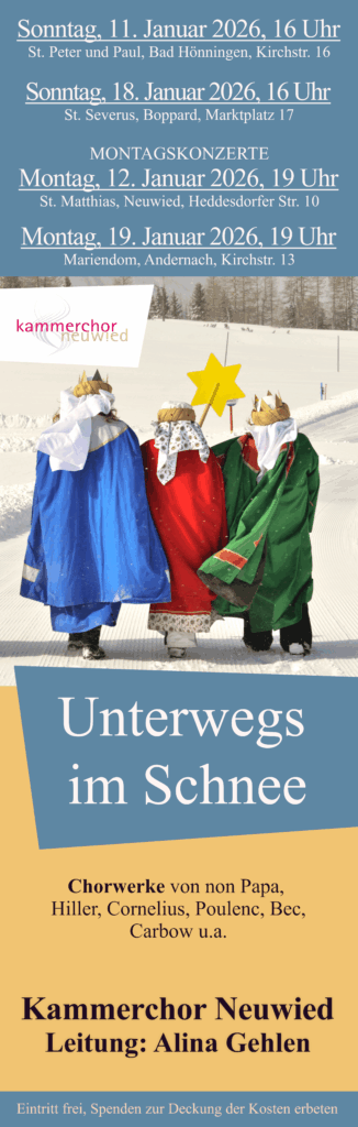 Unsere letzten KonzerteMit Klick auf „Programm“ erfahren Sie mehr zum jeweiligen Konzert. 2026: Unterwegs im SchneeProgramm .2025: Ave maris stellaProgramm .2024: Nicht von dieser WeltProgramm .2024: Schau hin nach GolgathaProgramm .2023: In Gottes LiebeProgramm .2023: Christ ist erstandenProgramm .2022: Verleih uns Frieden gnädiglichProgramm .2020: PassioProgramm .2019: Fauré - RequiemProgramm .2019: WeihnachtshistorieProgramm .2018: RaumKlänge - KlangRäumeProgramm .2018: Herr, erhöre meine WorteProgramm .2017: Mozart - RequiemProgramm .2017: Ceremony of CarolsProgramm .2016: Wie konnten wir denn Singen?Programm .2015: Missa 2Programm .2015: Missa 1Programm .2015: CrucifixionProgramm .
